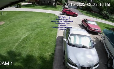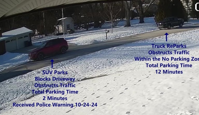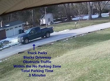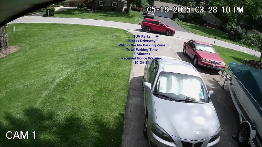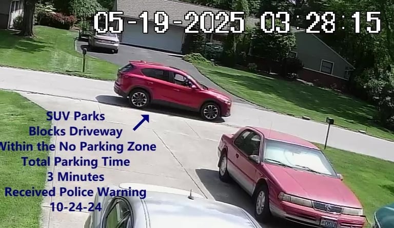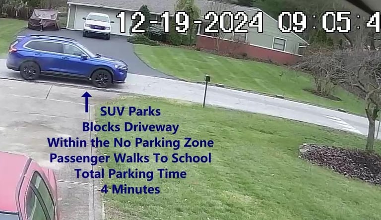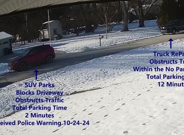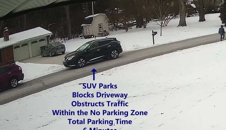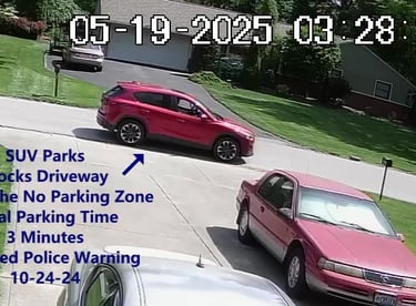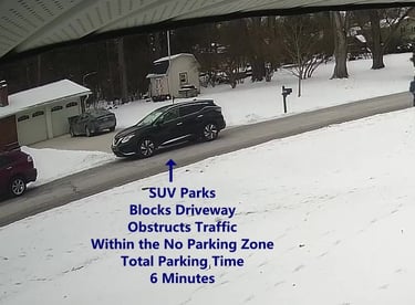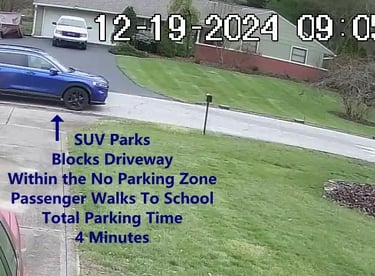 SUV - Parks blocking the Driveway at 4300 Cameron Rd, within the No Parking Zone, obstructs Traffic.