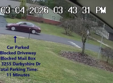 Car - Parks blocking the Driveway and Mail Box at 3255 Darbyshire Dr, within the No Parking Zone, obstructs Traffic.