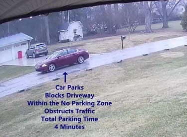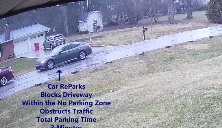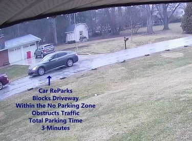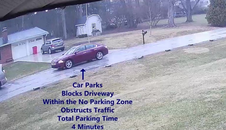 Car 1 - Parks blocking the Driveway at 4301 Cameron Rd, within the No Parking Zone, obstructs Traffic.