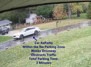 Car 2 - Parks blocking the Driveway at 4301 Cameron Rd, within the No Parking Zone, obstructs Traffic.