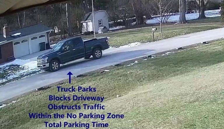 Truck - Parks blocking the Driveway at 4301 Cameron Rd, within the No Parking Zone, obstructs Traffic.