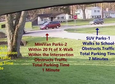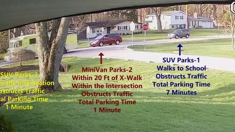SUV 1 - Parks on Darbyshire Dr, walks to the school, obstructs Traffic - Total Parking Time was 7 minutes.