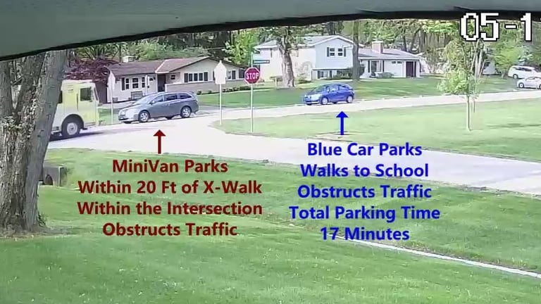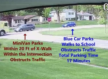Blue Car - Parks on Darbyshire Dr, walks to the school, obstructs Traffic - Total Parking Time was 17 minutes.