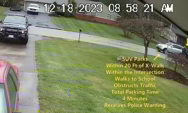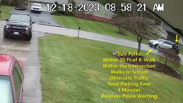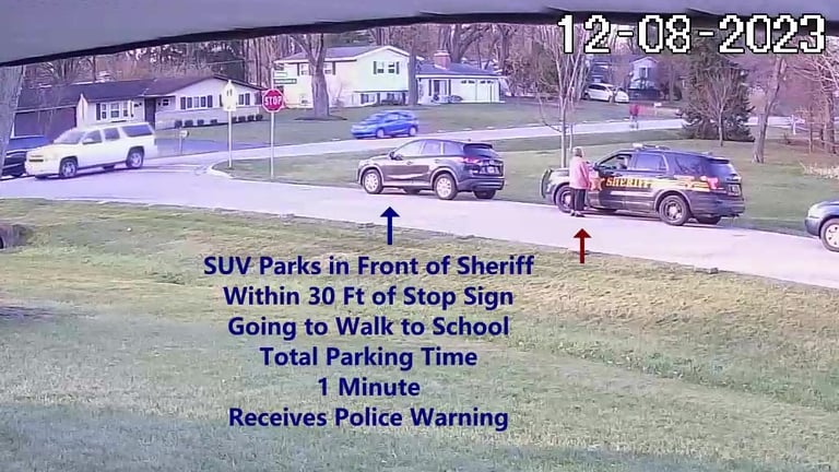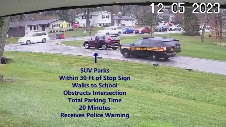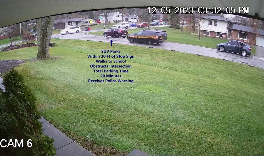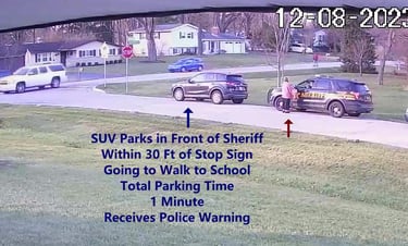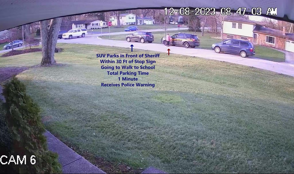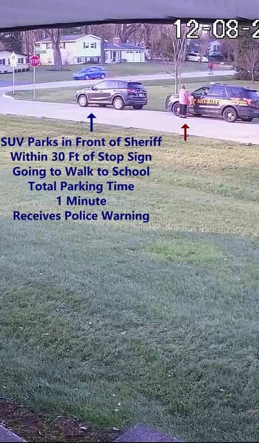 SUV - Parks on Cameron in Front of the Sherriff, within 30 Ft of Stop Sign, starts to walk over to the School.