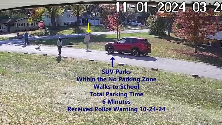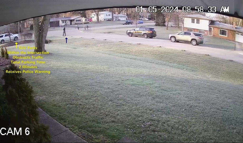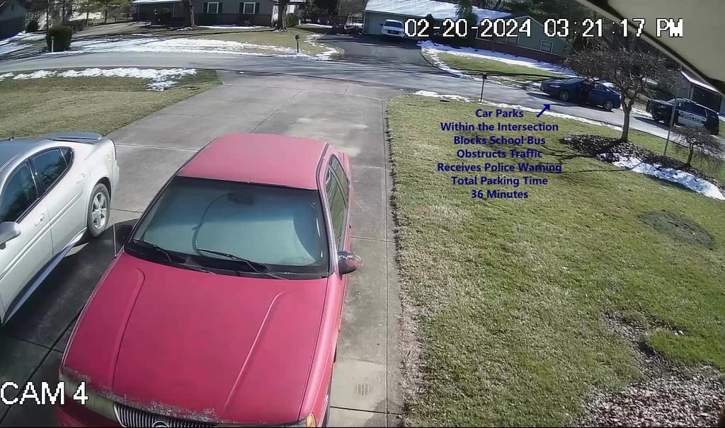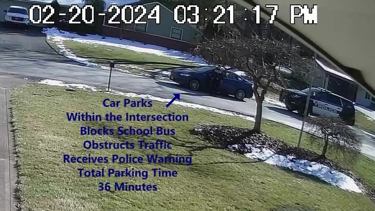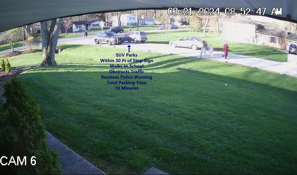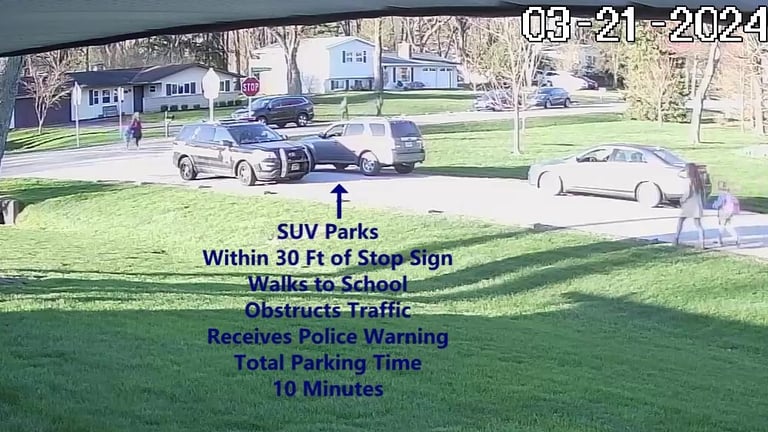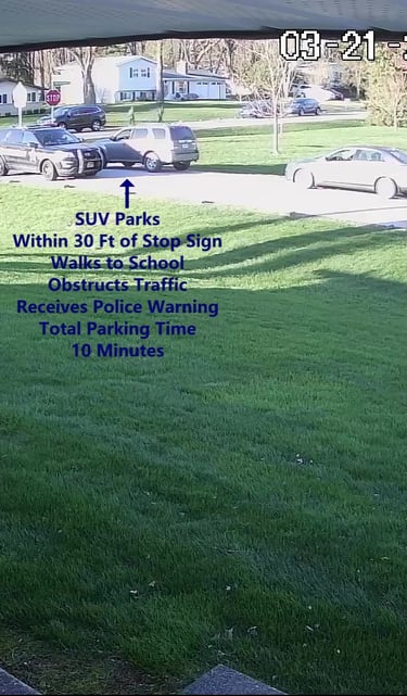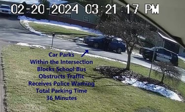 Vehicle 2 - Parks on Darbyshire, within the Intersection, walks over to school, obstructs Traffic - Total Parking Time was 12 minutes.