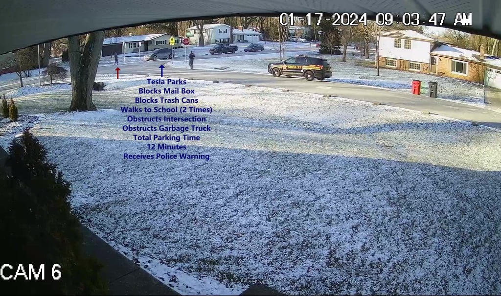 Tesla - Parks on Darbyshire, Blocks Mail Box, Blocks Trash Cans, obstructs the Intersection, obstructs the Garbage Truck.