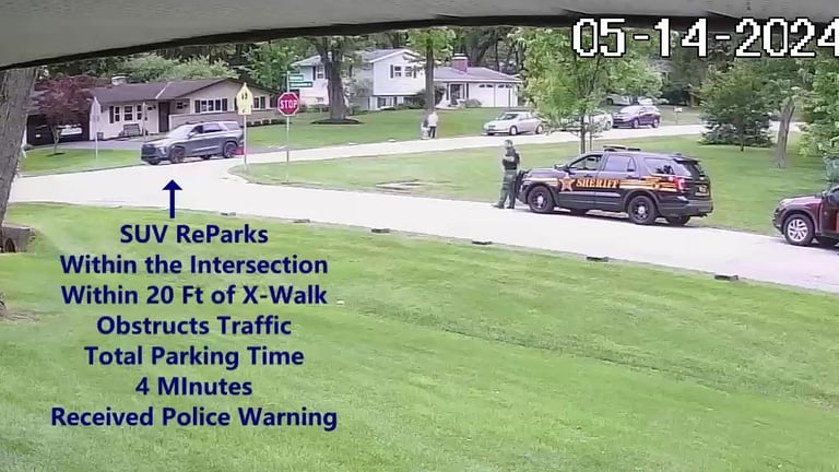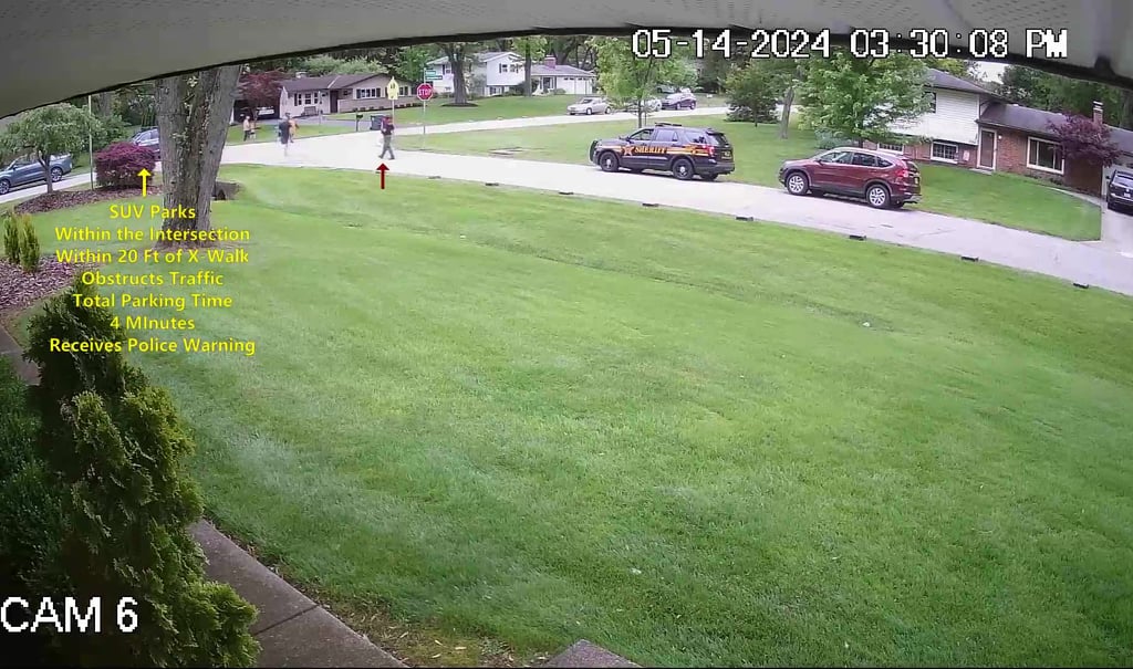 Vehicle 4 - Parks on Darbyshire, within 20 Ft of X-Walk, within the Intersection, obstructs Traffic - Total Parking Time was 1 minute - UNTIL SHERIFF GIVES HER WARNING ABOUT PARKING IN THE INTERSECTION AND TOO CLOSE TO THE X-WALK.