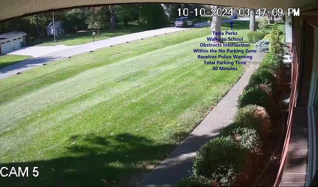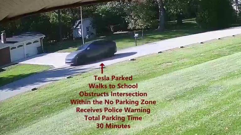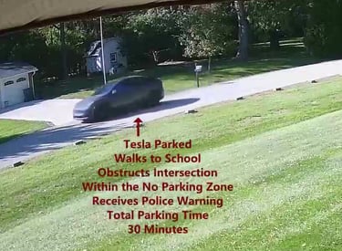 Tesla - Parks on Cameron, walks over to the school, within the No Parking Zone, obstructs Intersection.