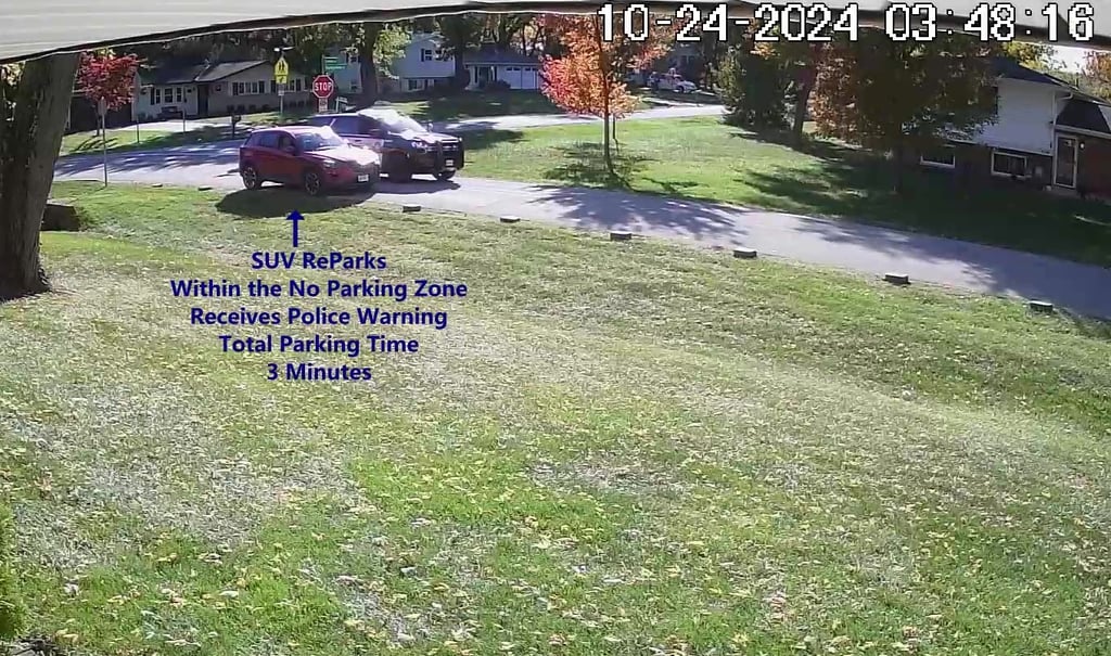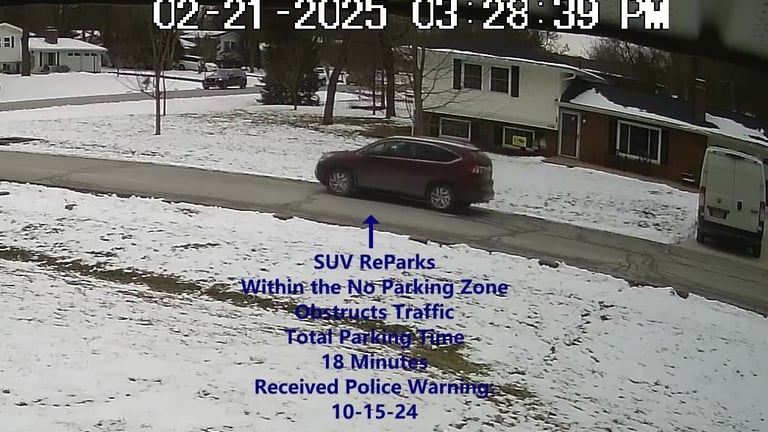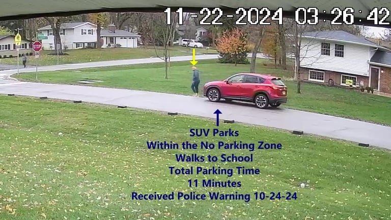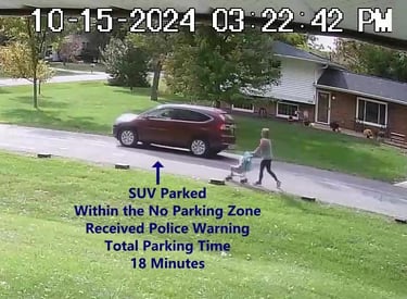 SUV - Parks on Darbyshire Dr, within the No Parking Zone, obstructs Traffic.