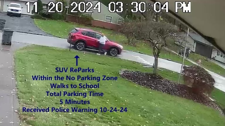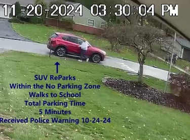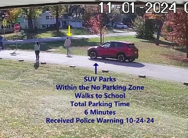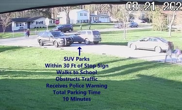 Vehicle 3 - Parks on Darbyshire, walks over to school, obstructs Traffic - Total Parking Time was 16 minutes.