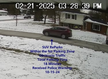 SUV - Parks on Darbyshire, within the No Parking Zone, Blocks Driveway at 3255 Darbyshire, obstructs Traffic - Total Parking Time was 1 minutes.