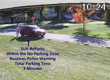 SUV - ReParks on Cameron, within the No Parking Zone, obstructs Traffic - Total Parking Time was 3 minutes.