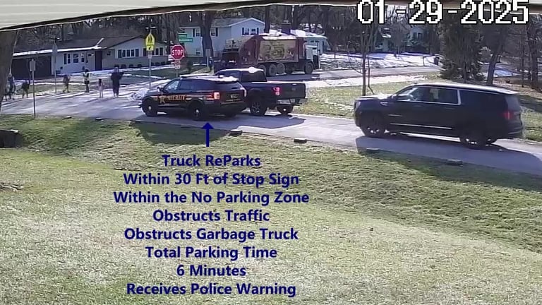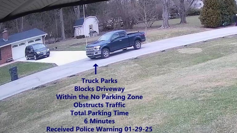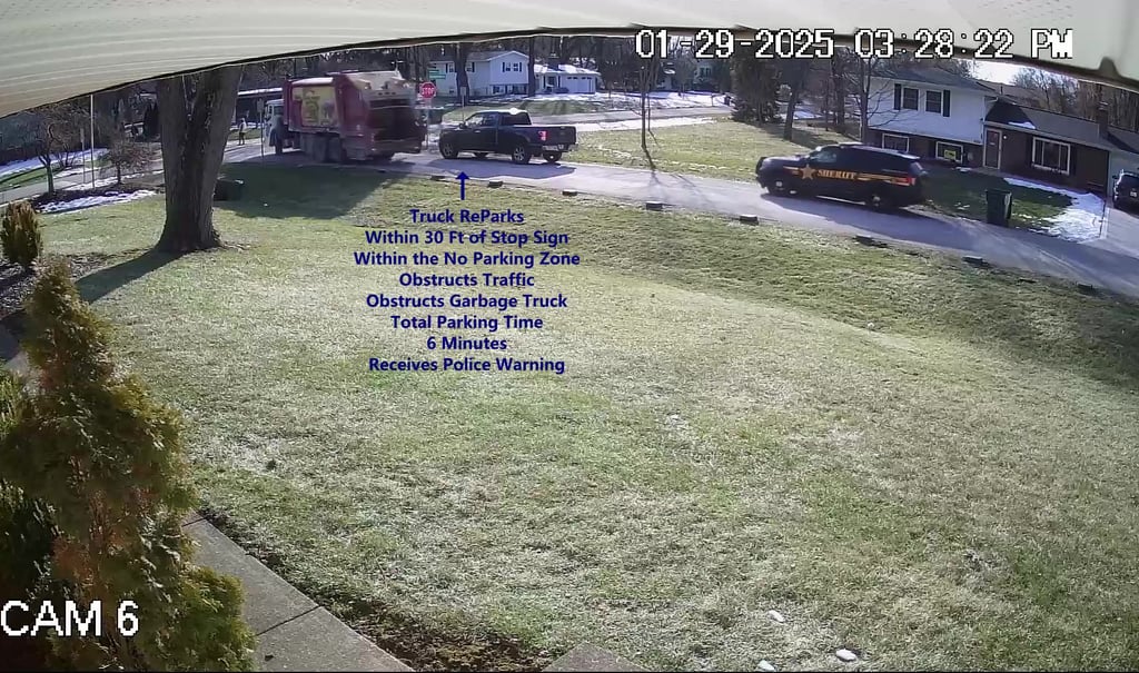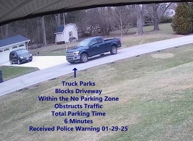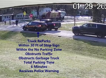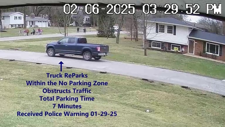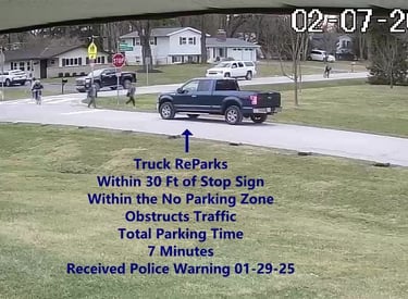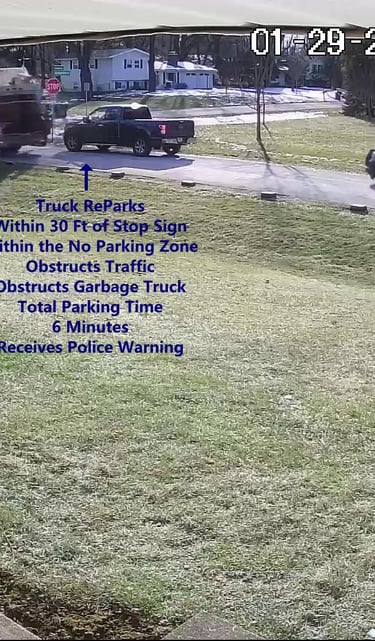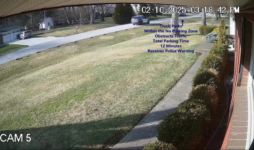 Truck - Parks on Cameron, Blocks Driveway, within the No Parking Zone, obstructs Traffic.