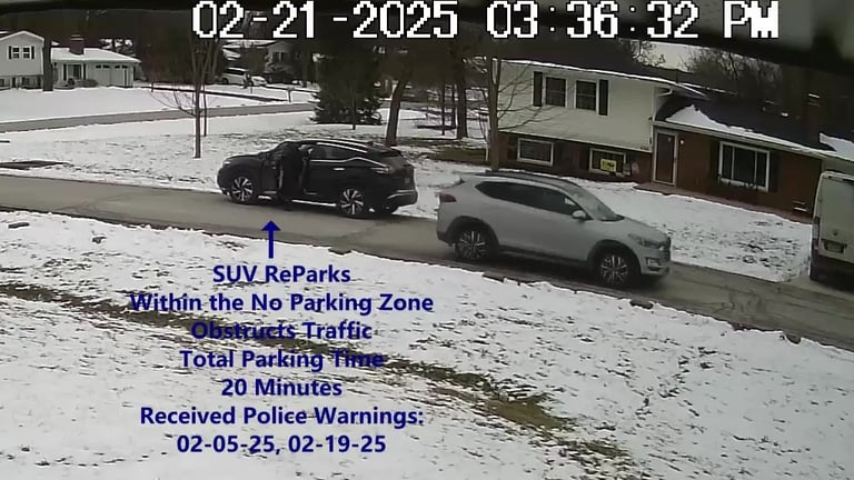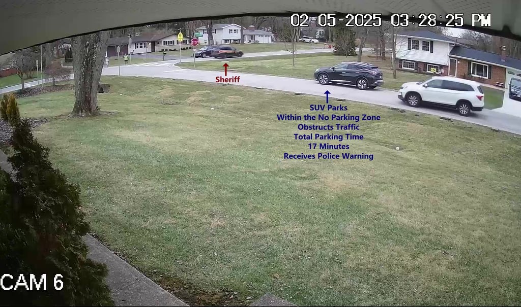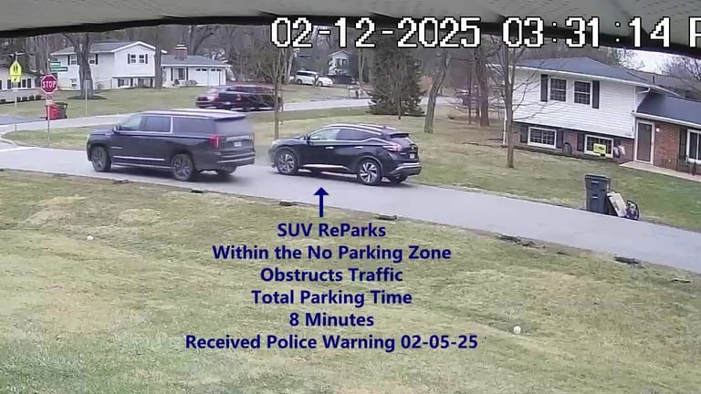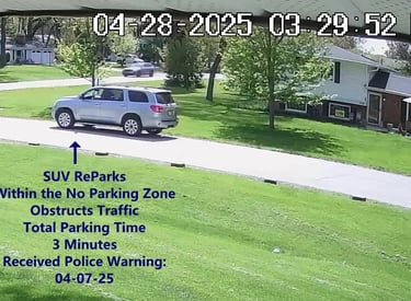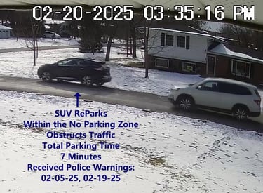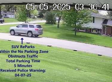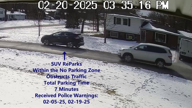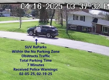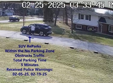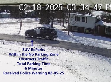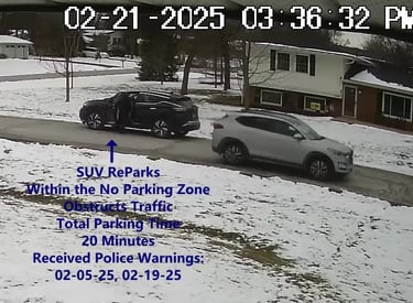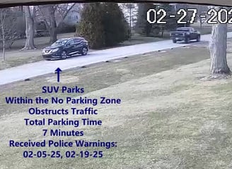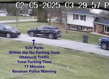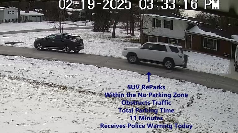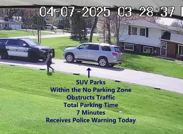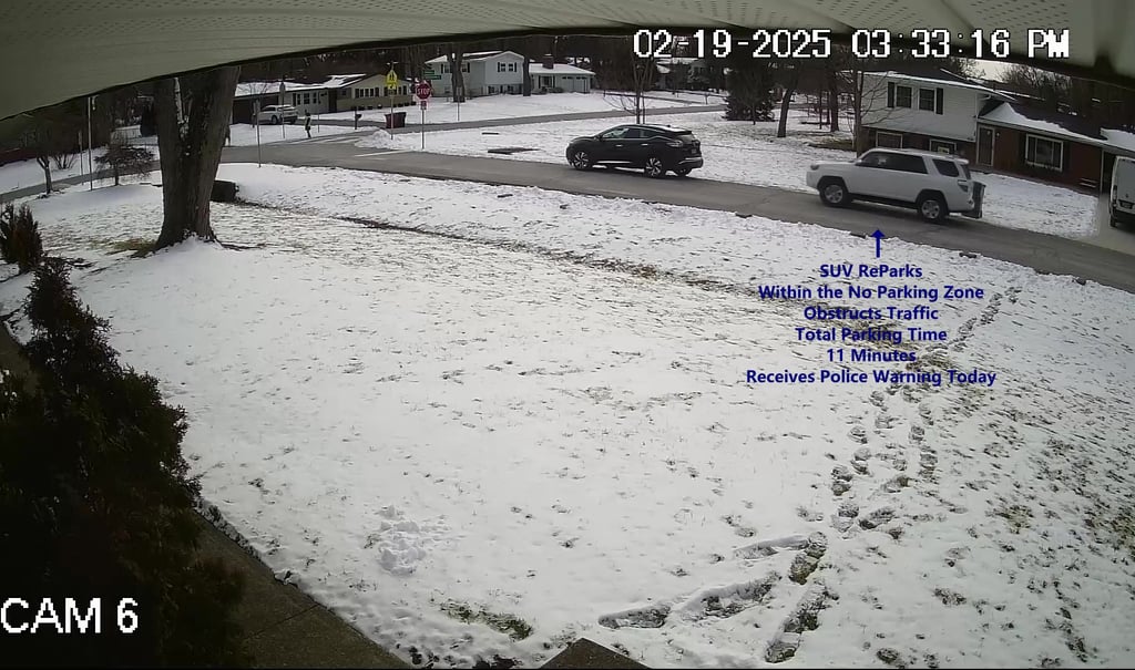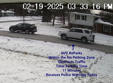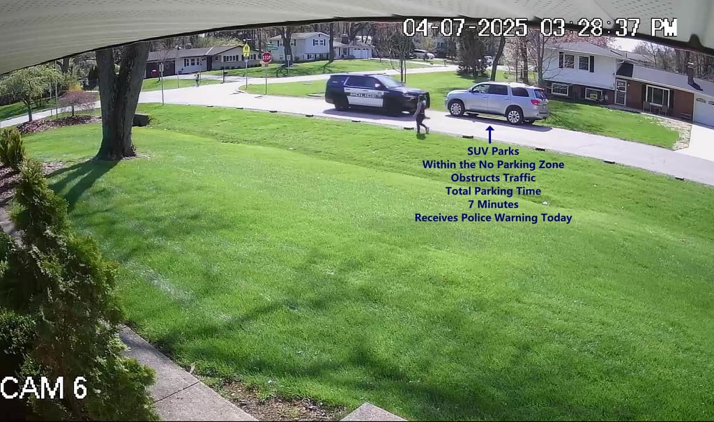 White SUV - Parks on Cameron, within the No Parking Zone, obstructs Traffic.