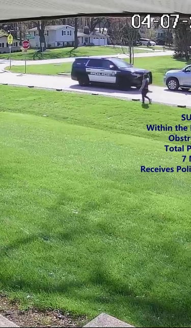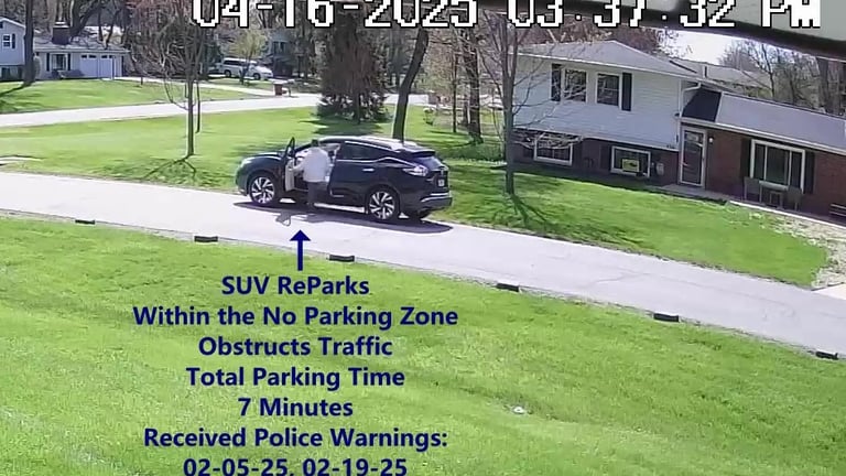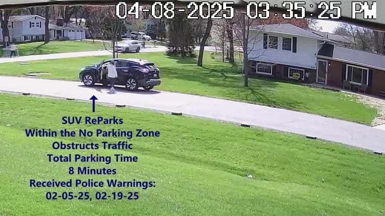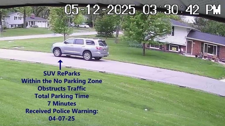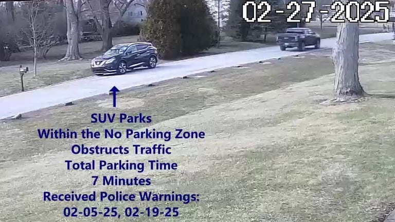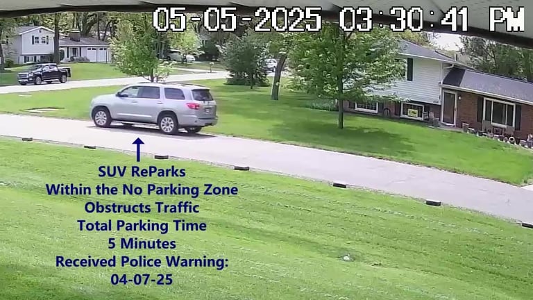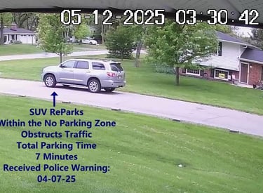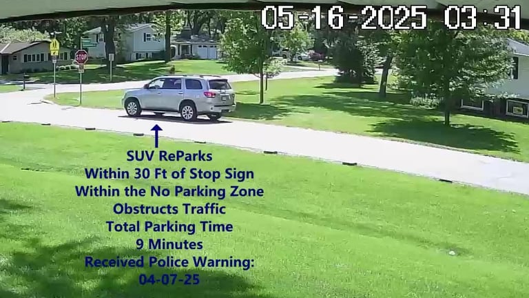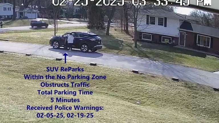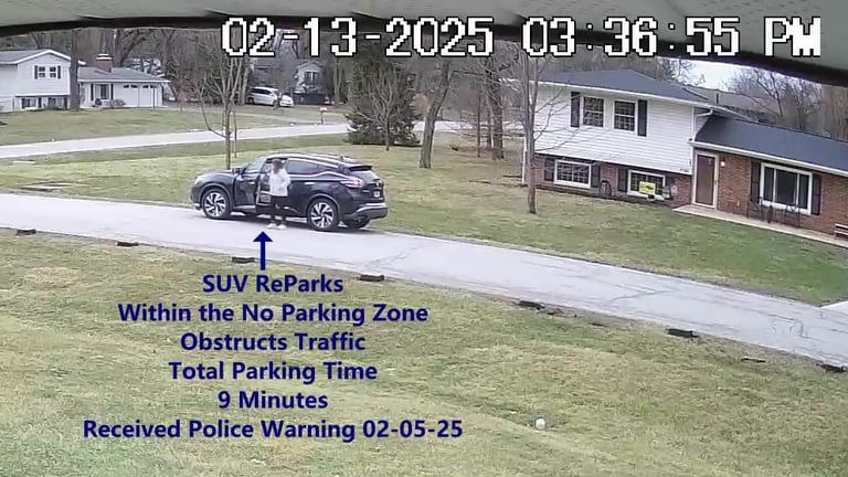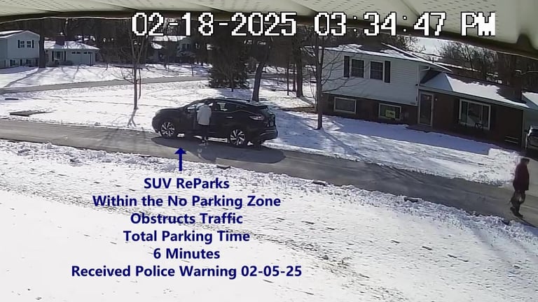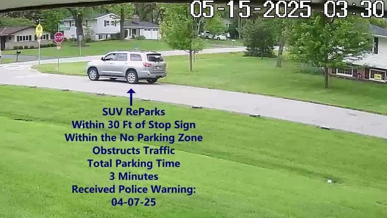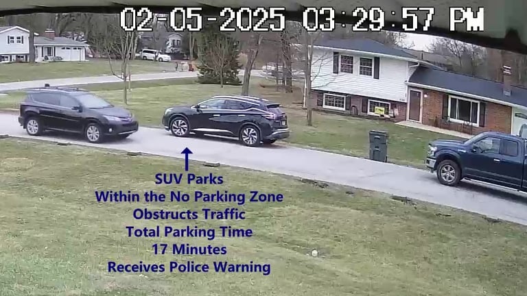 White SUV - Parks on Cameron, within the No Parking Zone, obstructs Traffic.