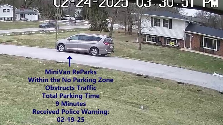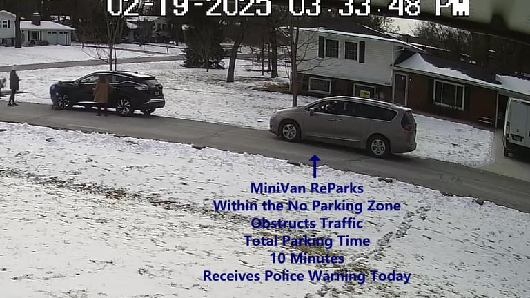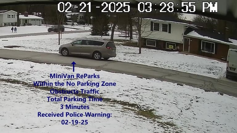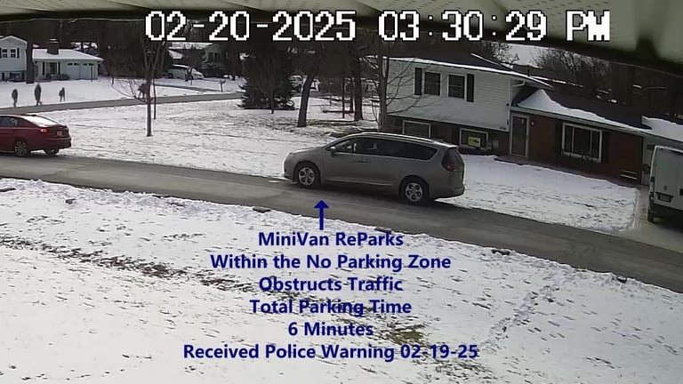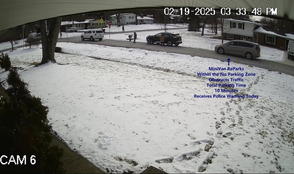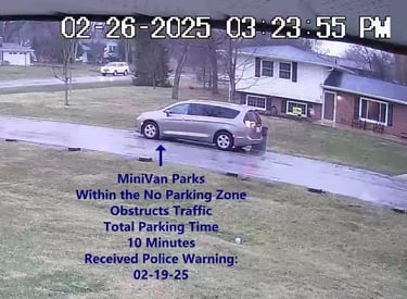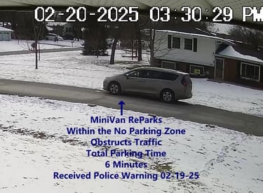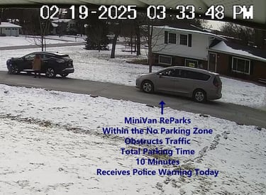 MiniVan - Parks on Cameron, within the No Parking Zone, obstructs Traffic.