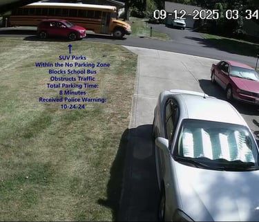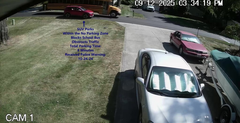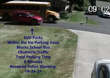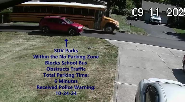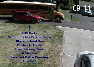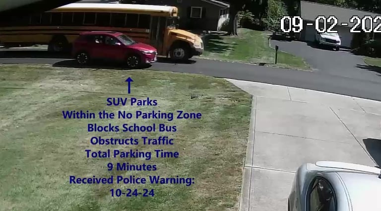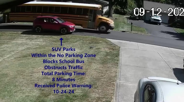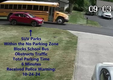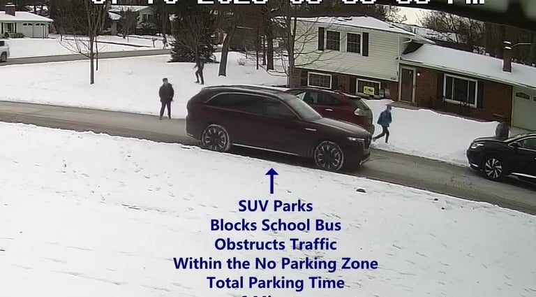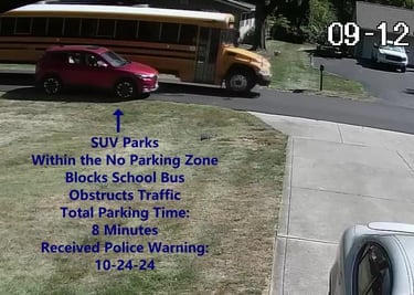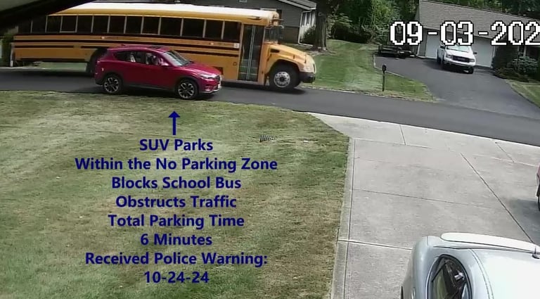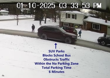 SUV - Parks on Darbyshire Dr, within the No Parking Zone, blocks School Bus, obstructs Traffic.