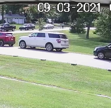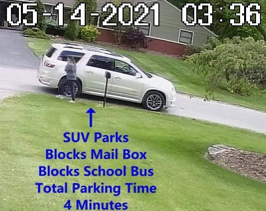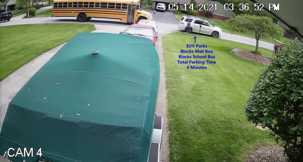 White SUV - Parks on Cameron Rd, walks over to the school, obstructs Traffic - Total Parking Time was 14 minutes.