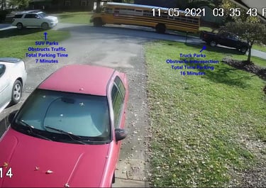 White SUV - Parks on Cameron Rd, exits the vehicle, obstructs Traffic - Total Parking Time was 11 minutes.
