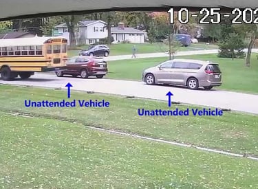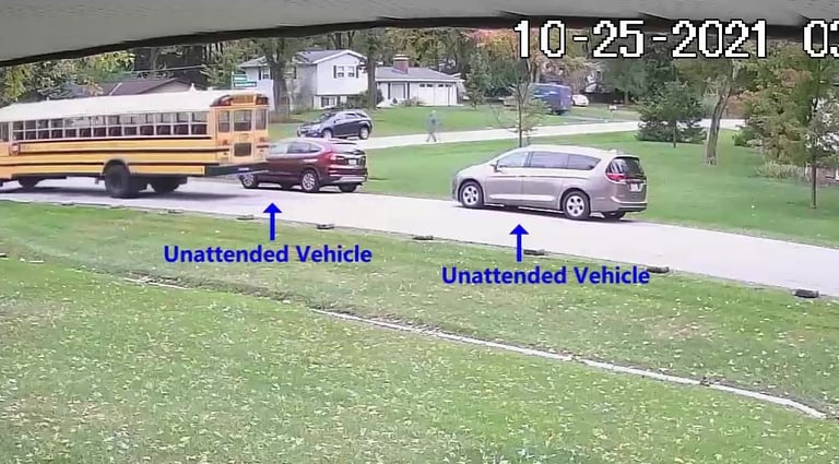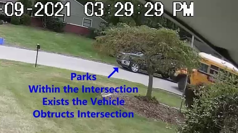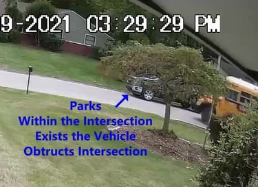 2 Vehicles parked in the Intersection Obstructing the School Bus from turning the corner.