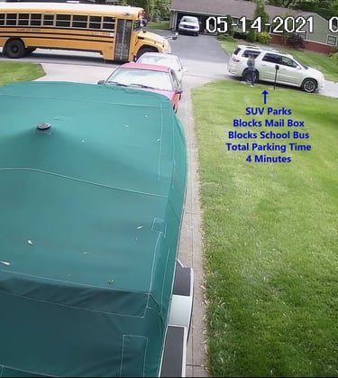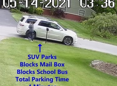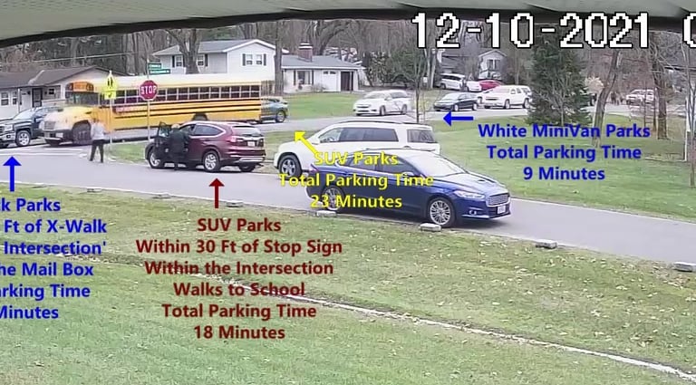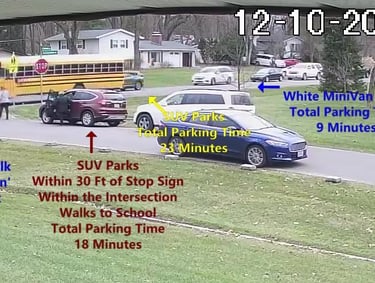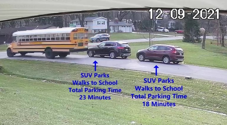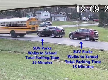White SUV - Parks on Cameron Rd, walks over to the school, obstructs Traffic - Total Parking Time was 16 minutes.
