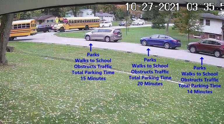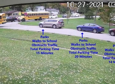 Blue Car - Parks on Cameron Rd, walks over to the school, obstructs Traffic - Total Parking Time was 21 minutes.