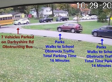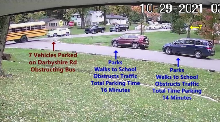 7 Vehicles are PARKED on Darbyshire Dr obstructing the Bus.