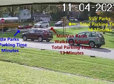 MiniVan - Parks on Cameron Rd, walks over to the school, obstructs Traffic - Total Parking Time was 13 minutes.
