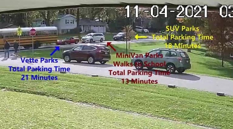 MiniVan - Parks on Cameron Rd, walks over to the school, obstructs Traffic - Total Parking Time was 6 minutes.