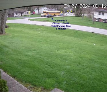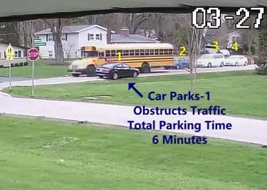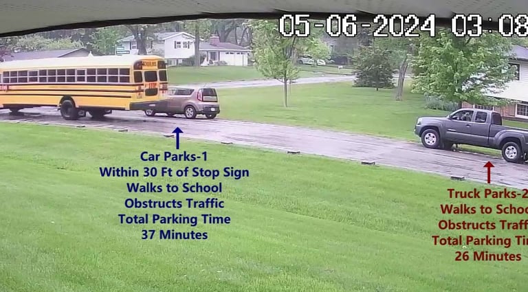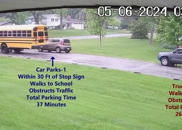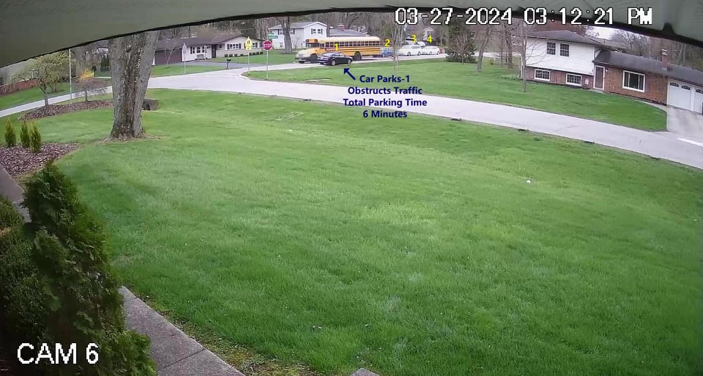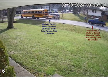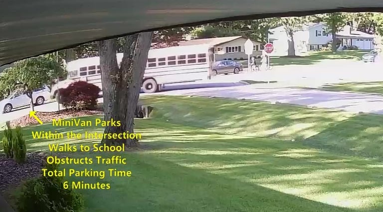 Car 1 - Parks on Darbyshire Dr, walks over to the School, obstructs Traffic - Total Parking Time was 6 minutes.