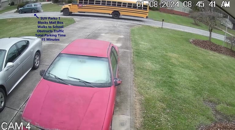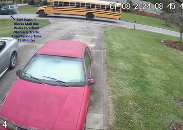 SUV 1 - Parks on Darbyshire Dr, obstructs Mail Box, walks over to the School, obstructs Traffic - Total Parking Time was 20 minutes.