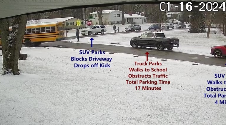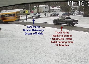 SUV 1 - Parks on Darbyshire Dr, walks over to the School, obstructs Traffic - Total Parking Time was 16 minutes.