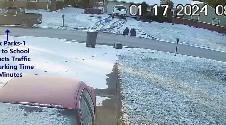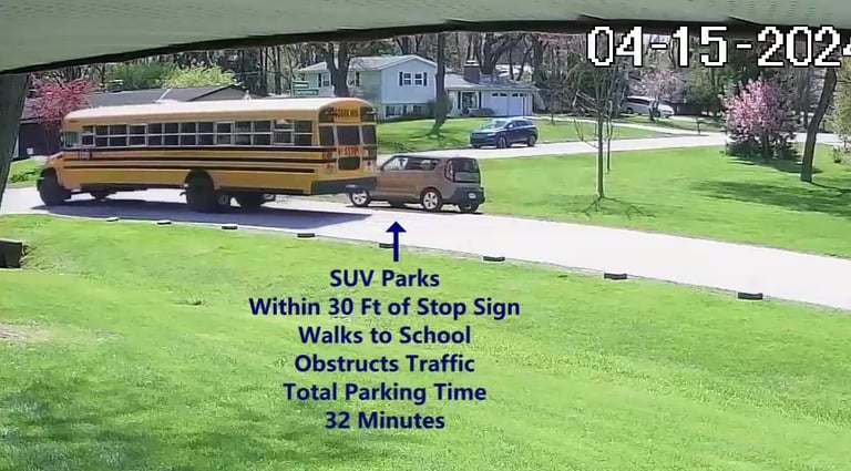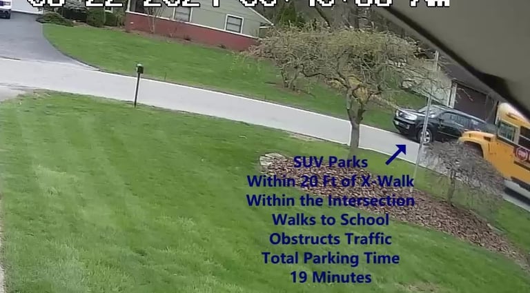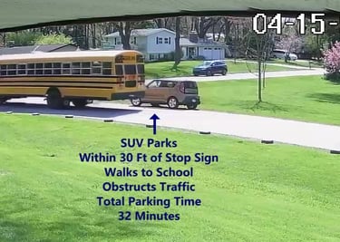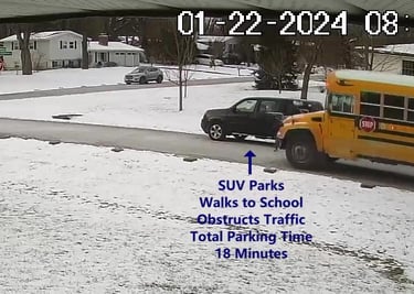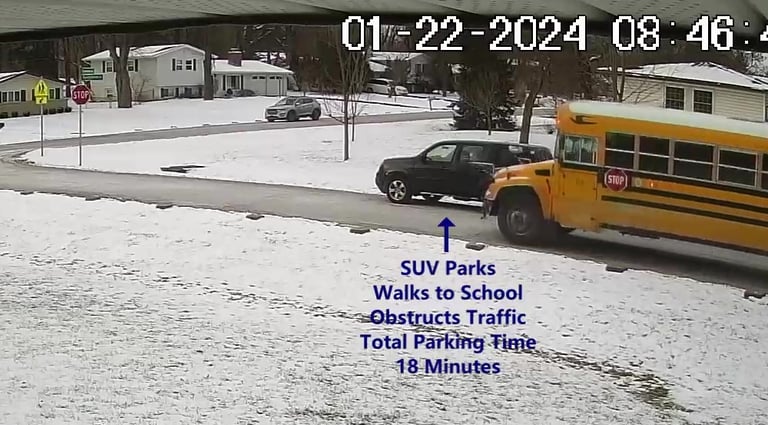 SUV 1 - Parks on Darbyshire Dr, walks over to the School, obstructs Traffic - Total Parking Time was 19 minutes.