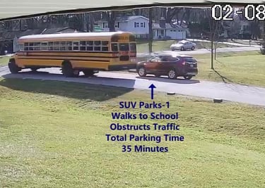 SUV 1 - Parks on Cameron Rd, walks over to the School, obstructs Traffic - Total Parking Time was 35 minutes.