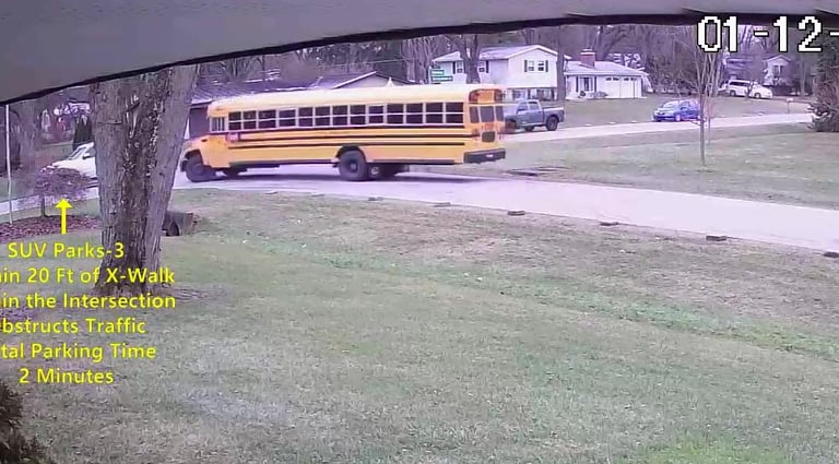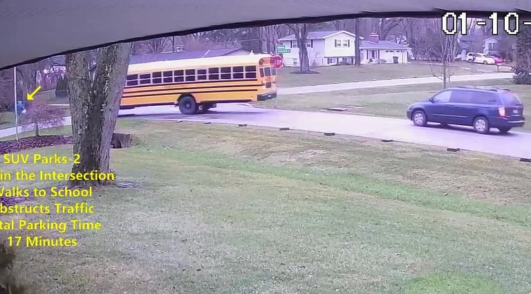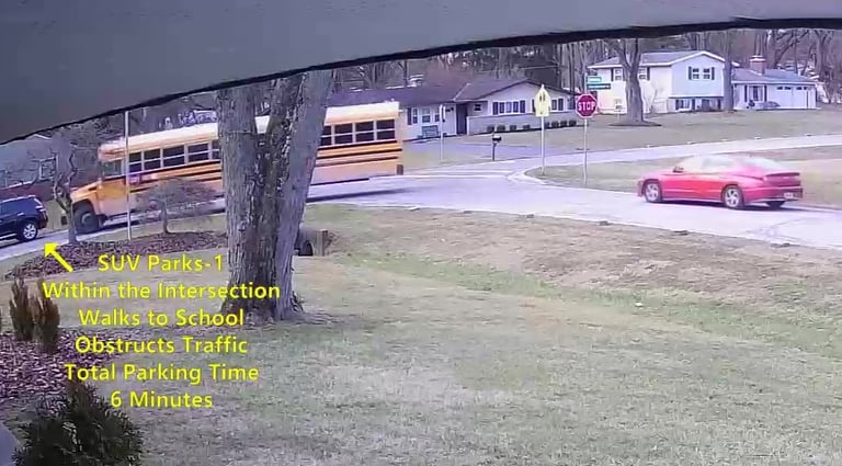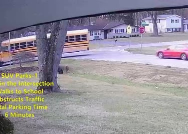 SUV 1 - Parks on Darbyshire Dr, within the Intersection, walks over to the School, obstructs Traffic - Total Parking Time was 6 minutes.