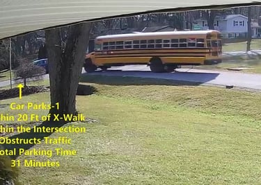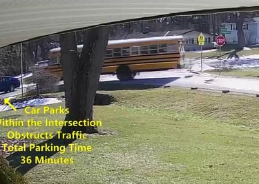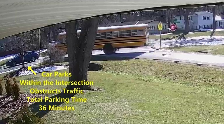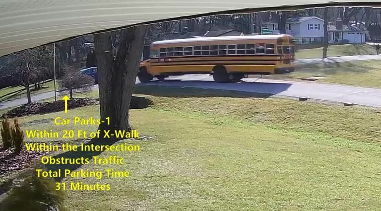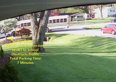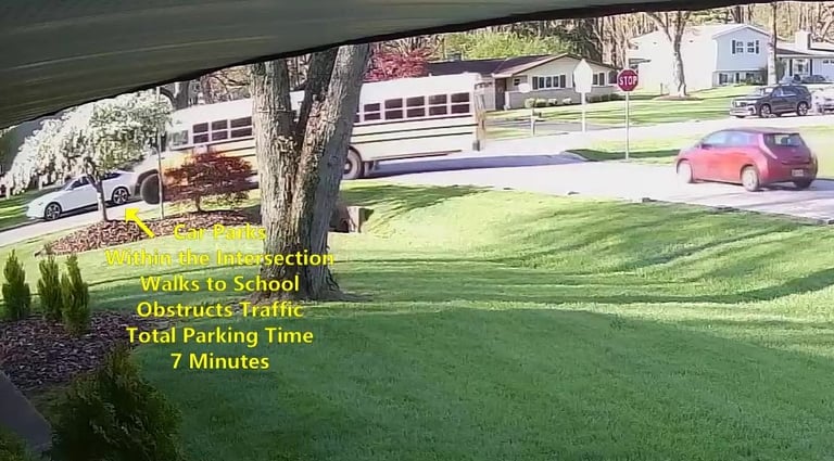 Car 2 - Parks on Darbyshire Dr, within the Intersection, walks over to the School, obstructs Traffic - Total Parking Time was 7 minutes.