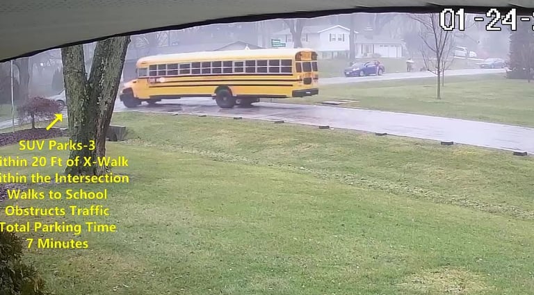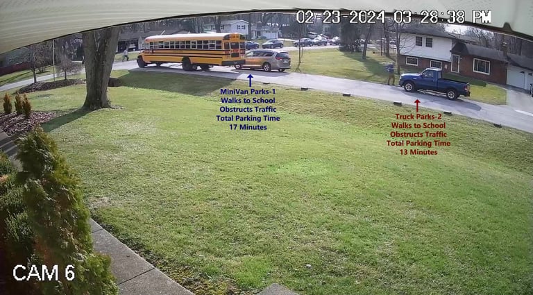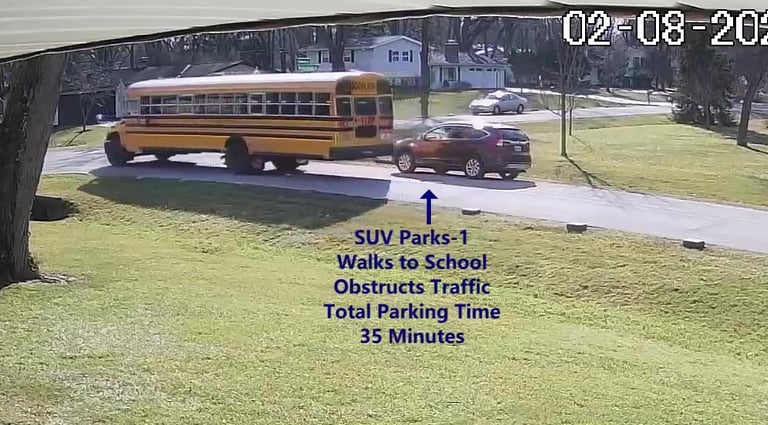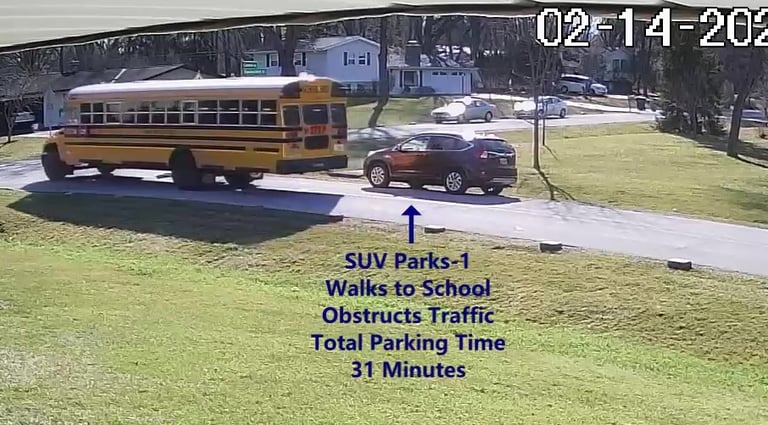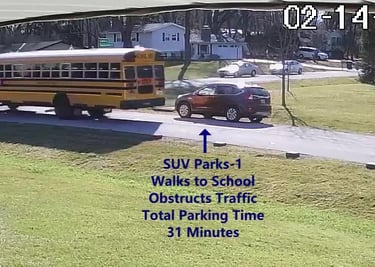 SUV 1 - Parks on Darbyshire Dr, walks over to the School, obstructs Traffic - Total Parking Time was 6 minutes.