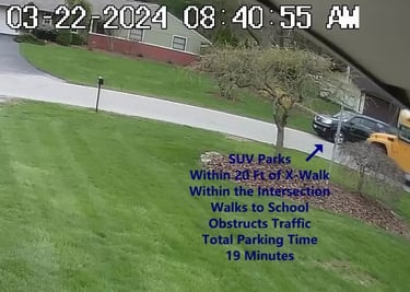 SUV 3 - Parks on Darbyshire Dr, within 20 Ft of X-Walk, within the Intersection, walks over to the School, obstructs Traffic - Total Parking Time was 7 minutes.