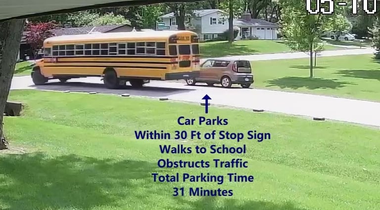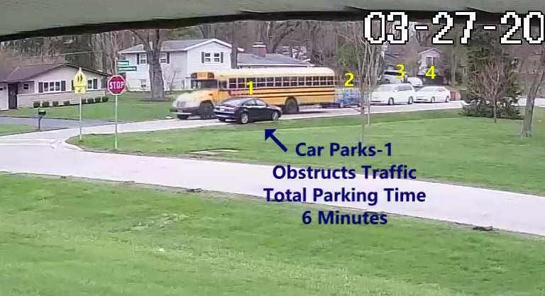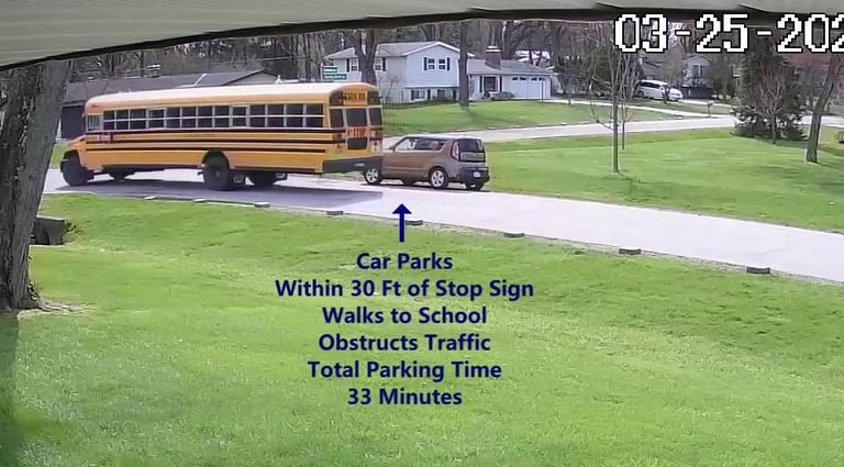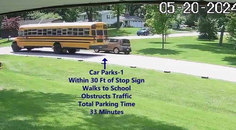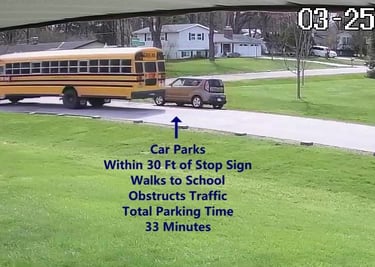 Car 4 - Parks on Darbyshire Dr, walks over to the School, obstructs Traffic - Total Parking Time was 20 minutes.