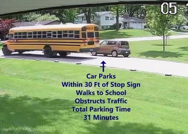Car 1 - Parks on Cameron Rd, within 30 Ft of Stop Sign, walks over to the School, obstructs Traffic - Total Parking Time was 31 minutes.
