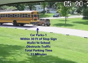 Car 1 - Parks on Cameron Rd, within 30 Ft of Stop Sign, walks over to the School, obstructs Traffic - Total Parking Time was 33 minutes.