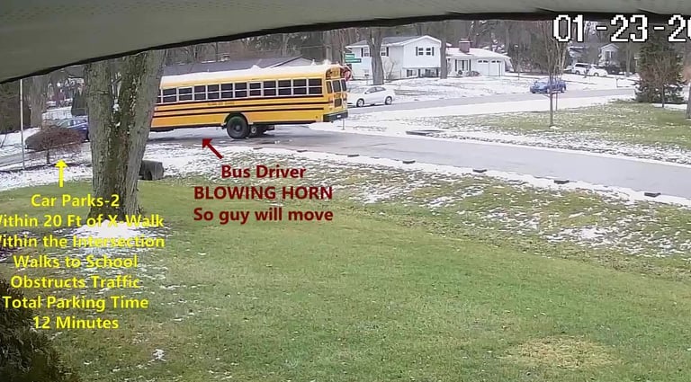 Car 2 - Parks on Darbyshire Dr, within 20 Ft of X-Walk, within the Intersection, walks over to the School, obstructs Traffic - Total Parking Time was 12 minutes.