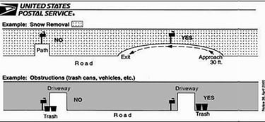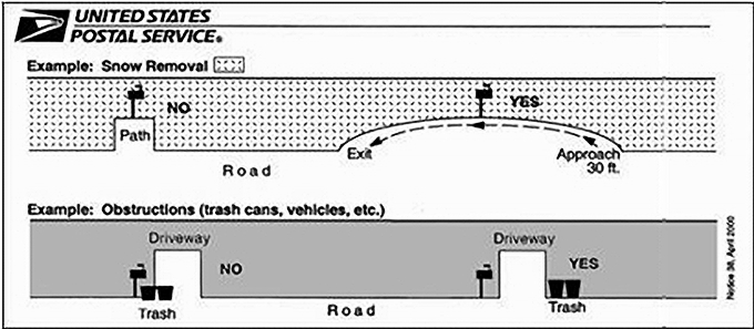 The below diagram shows how snow and other objects (VEHICLES) should be cleared for curbside mailboxes. A 30-foot approach is required – 15 feet before and 15 feet after the mailbox – to allow carriers to deliver mail safely.