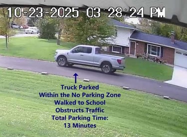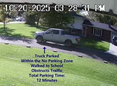 Car 2 - Parks on Cameron, Blocks Driveway, walks over to the school, obstructs Traffic - Total Parking Time was 3 minutes.