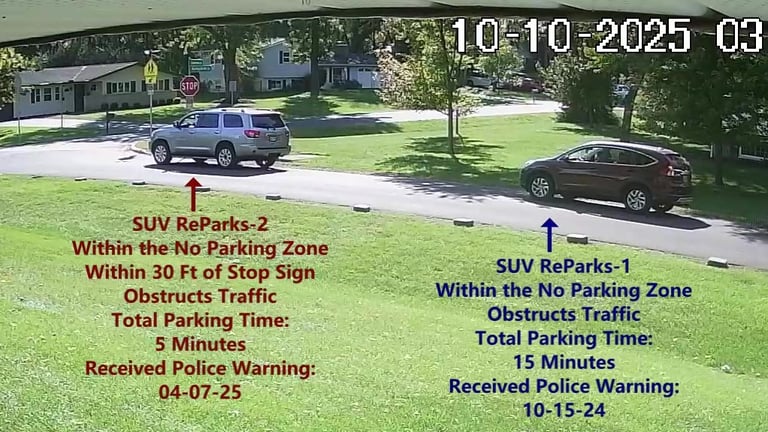 SUV - Parks on Cameron, within 30 Ft of Stop Sign, within the No Parking Zone, obstructs Traffic.