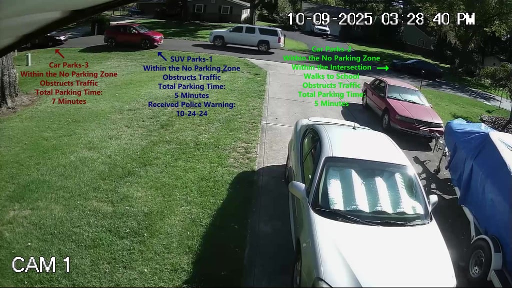 SUV 1 - Parks on Darbyshire Dr, within the No Parking Zone, obstructs Traffic - Total Parking Time was 5 minutes.