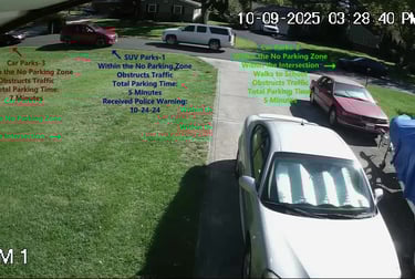 SUV 1 - Parks on Darbyshire Dr, within the No Parking Zone, obstructs Traffic - Total Parking Time was 9 minutes.