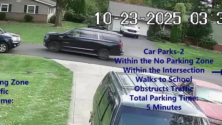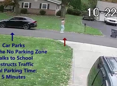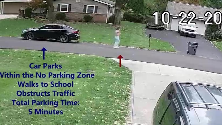 Car 2 - Parks on Darbyshire Dr, within the No Parking Zone, within the Intersection, walks over to the School, obstructs Traffic - Total Parking Time was 5 minutes.