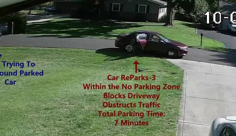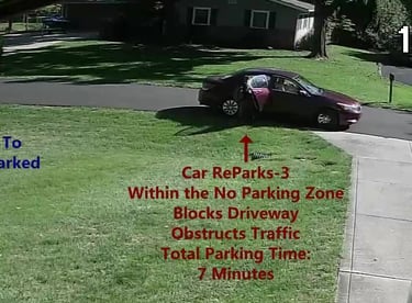 Car 1 - Parks blocking the Driveway at 4301 Cameron Rd, within the No Parking Zone, obstructs Traffic.