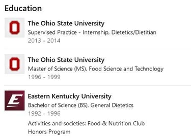 See the Education section below or Mrs. Conway's LinkedIn Page URL: https://www.linkedin.com/in/cindyconwayms-rdn-ld/